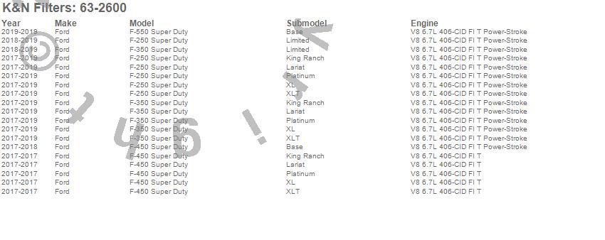 Below is an abbreviated list of applications for the 63 Series Aircharger Kit.F-250 Super Duty, F-350 Super Duty, F-450 Super Duty, F-550 Super Duty, Ford, 2019, 2018, 2017