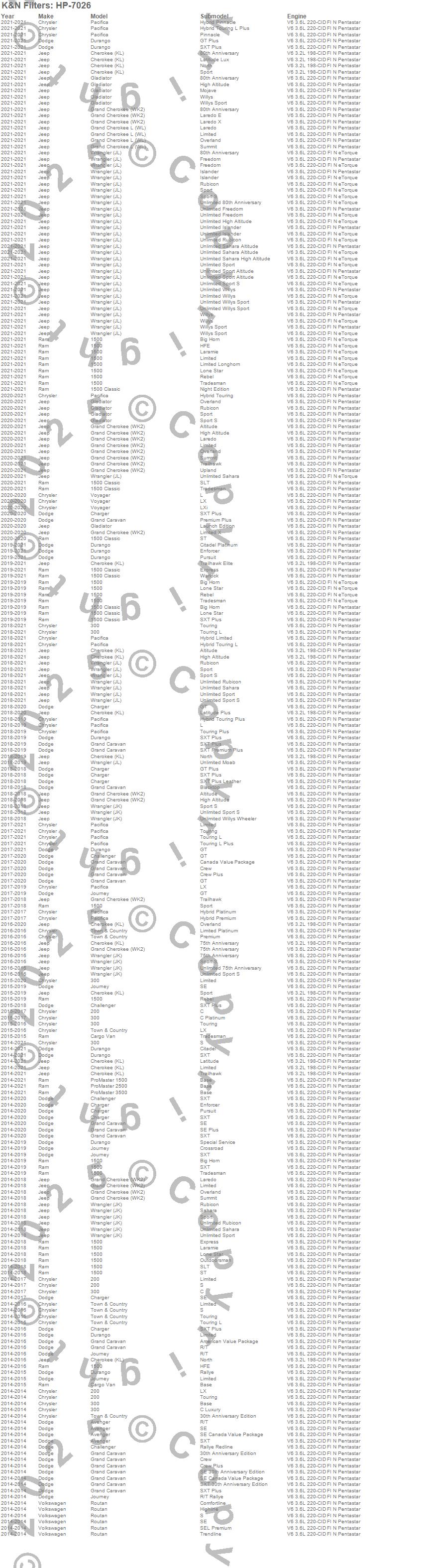 Below is an abbreviated list of applications for the Oil Filter.1500, 1500 Classic, 200, 300, Avenger, C/V, Challenger, Charger, Cherokee, Cherokee (KL), Durango, Grand Caravan, Grand Cherokee, Journey, Pacifica, ProMaster 1500, ProMaster 2500, ProMaster 3500, Routan, Town & Country