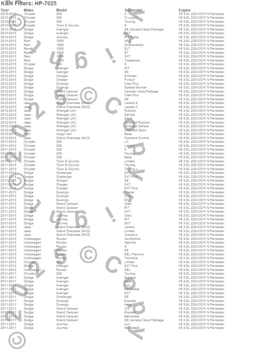 Below is an abbreviated list of applications for the Oil Filter.1500, 200, 300, Avenger, C/V, Challenger, Charger, Durango, Grand Caravan, Grand Cherokee, Journey, Routan, Town & Country, Wrangler (JK), Chrysler, Dodge, Jeep, Ram, Volkswagen, 2013