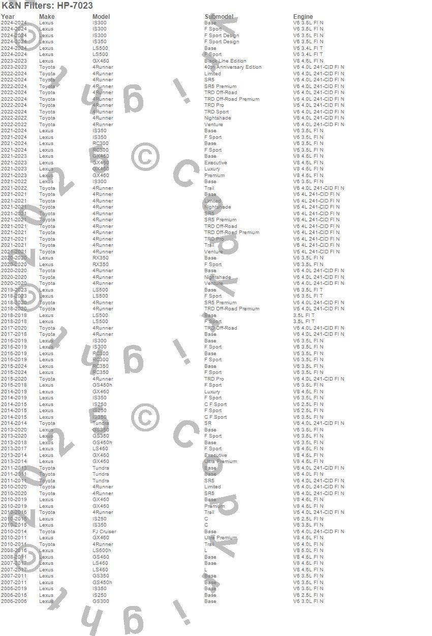 Below is an abbreviated list of applications for the Oil Filter.4Runner, FJ Cruiser, GS300, GS350, GS450h, GS460, GX460, IS250, IS300, IS350, LS460, LS500, LS500h, LS600h, LX570, RC300, RC350, Tundra, Lexus, Toyota
