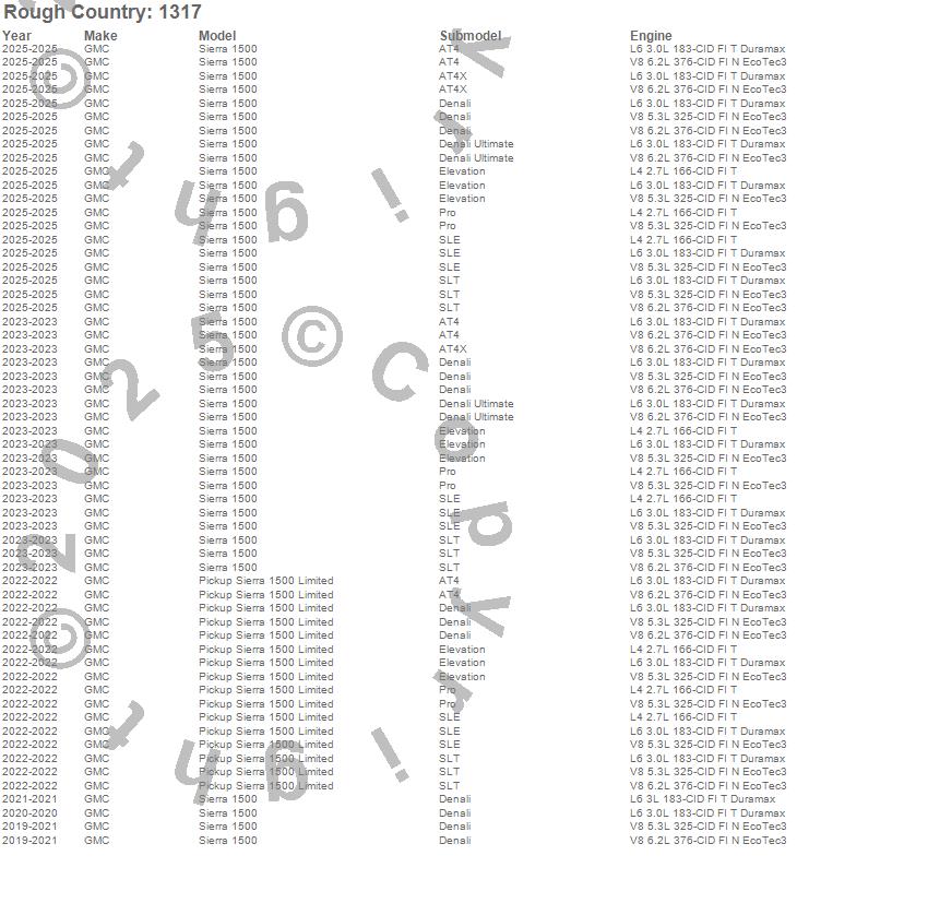 Below is an abbreviated list of applications for the Leveling Lift Kit.Pickup Sierra 1500 Limited, Sierra 1500, GMC, 2025, 2023, 2022, 2021, 2020, 2019
