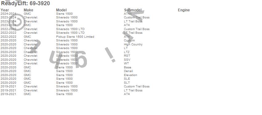 Below is an abbreviated list of applications for the SST Lift Kit.Pickup Sierra 1500 Limited, Sierra 1500, Silverado 1500, Silverado 1500 LTD, Chevrolet, GMC, 2024, 2023, 2022, 2021, 2020, 2019