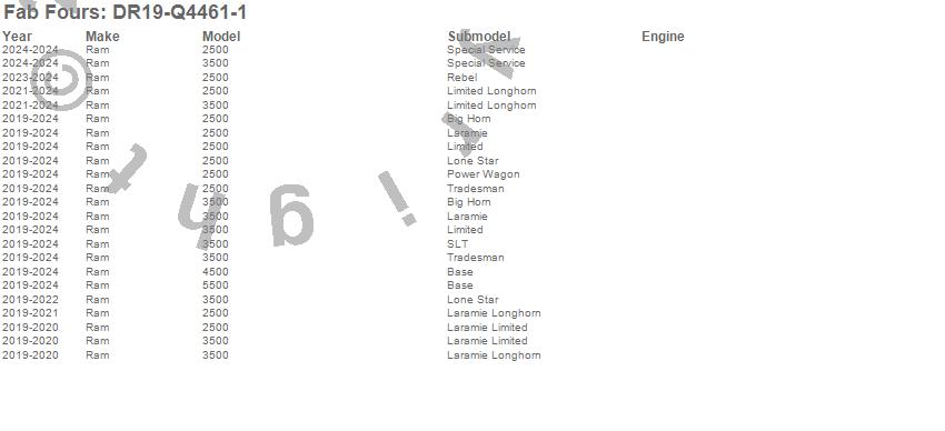 Brand: Fab FoursPart Number: DR19-Q4461-1Bumper- Front Type: Black Steel - Front w/No GuardUPC: 005810119812