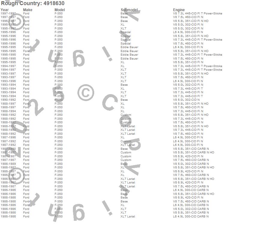Below is an abbreviated list of applications for the Suspension Lift Kit.F-350, Ford, 1997, 1996, 1995, 1994, 1993, 1992, 1991, 1990, 1989, 1988, 1987, 1986