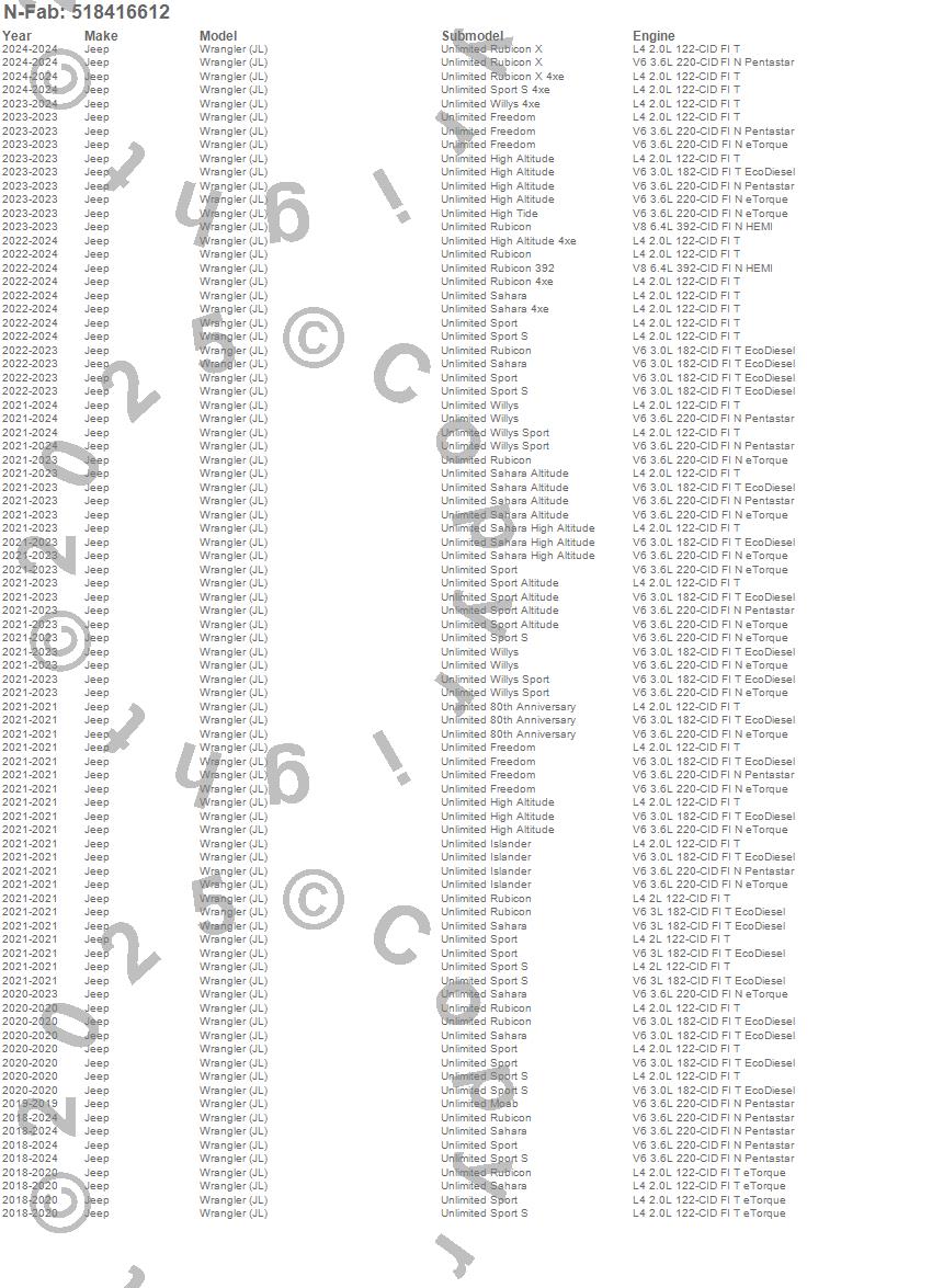 Below is an abbreviated list of applications for the Full Length Nerf Step RS Bar.Wrangler, Wrangler (JL), Jeep, 2026, 2025, 2024, 2023, 2022, 2021, 2020, 2019, 2018