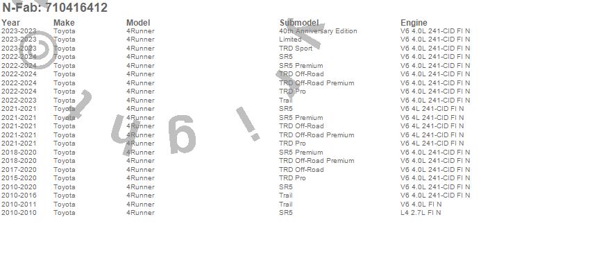 Below is an abbreviated list of applications for the Cab Length Nerf Step RS Bar.4Runner, Toyota, 2024, 2023, 2022, 2021, 2020, 2019, 2018, 2017, 2016, 2015, 2014, 2013, 2012, 2011, 2010