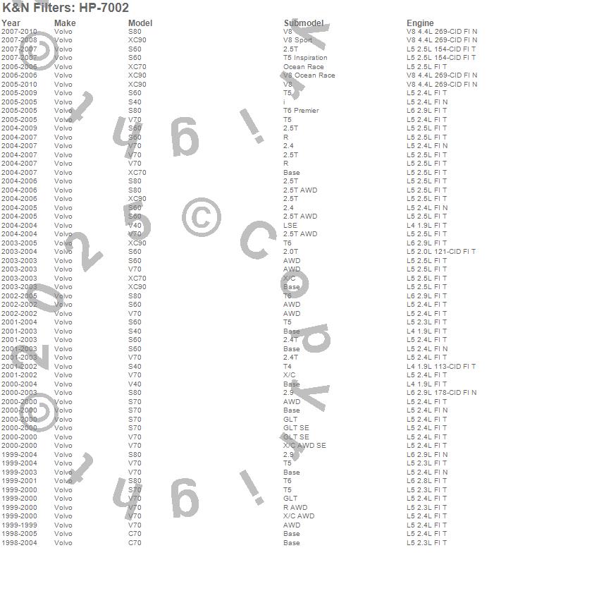 Below is an abbreviated list of applications for the Oil Filter.C70, S40, S60, S70, S80, V40, V70, XC70, XC90, Volvo, 2010, 2009, 2008, 2007, 2006, 2005, 2004, 2003, 2002, 2001