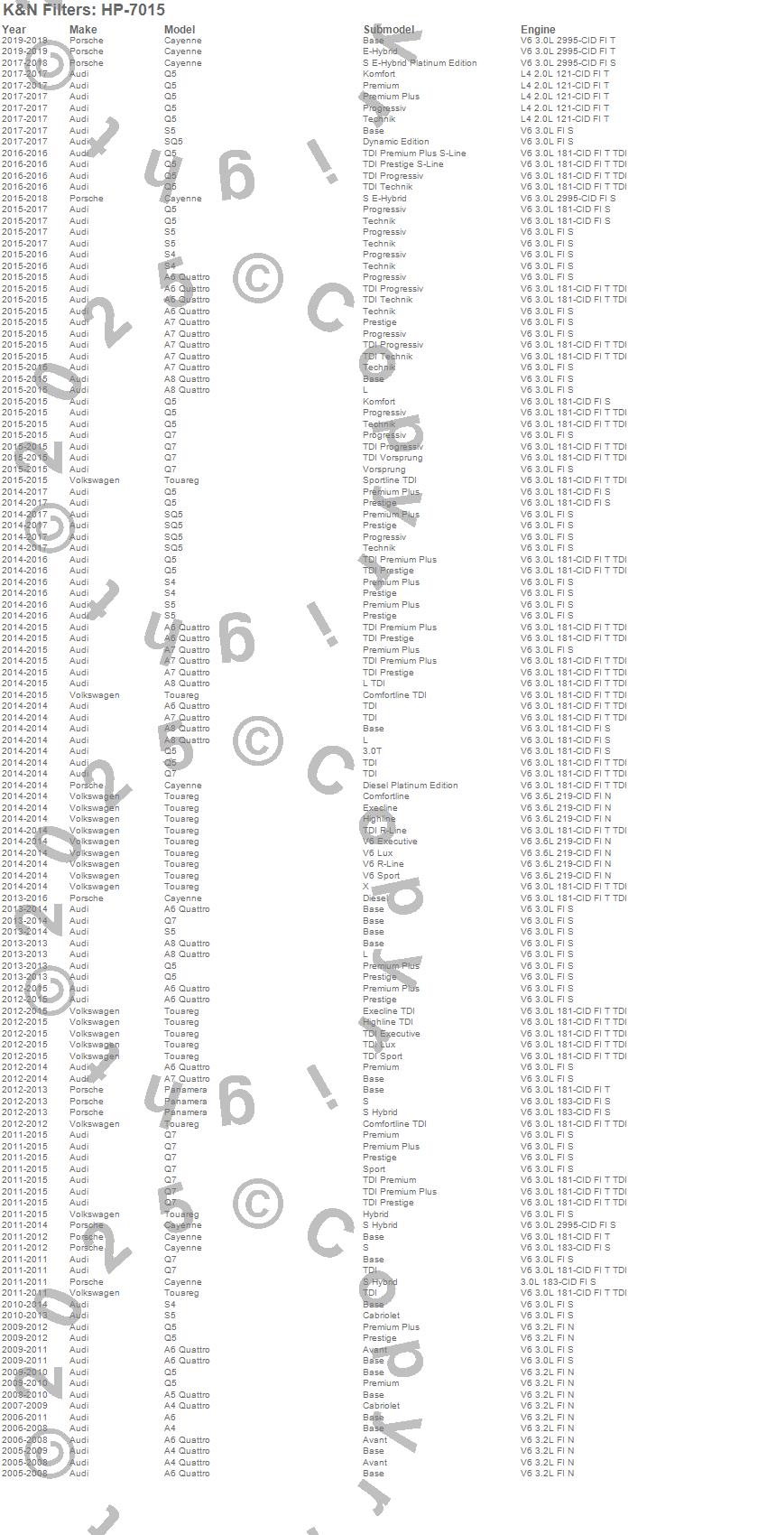 Below is an abbreviated list of applications for the Oil Filter.A4, A4 Quattro, A5 Quattro, A6, A6 Quattro, A7 Quattro, A8 Quattro, Cayenne, Q5, Q7, S4, S5, SQ5, Touareg, Audi, Porsche, Volkswagen, 2018, 2017, 2016