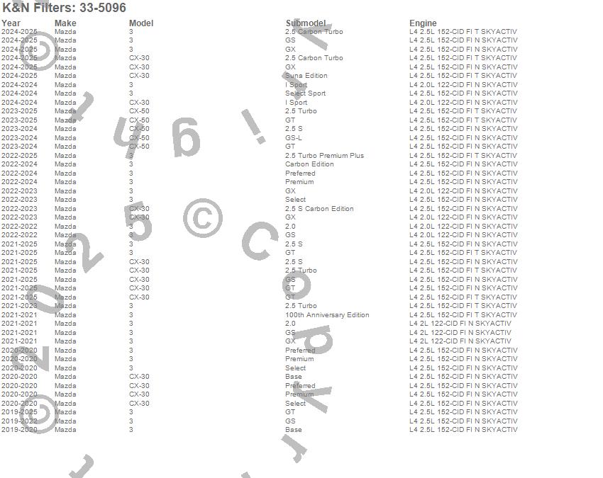 Below is an abbreviated list of applications for the Air Filter.3, Mazda, 2019