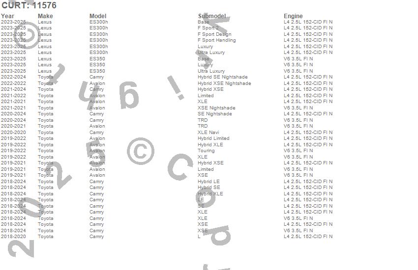 Below is an abbreviated list of applications for the Class I 1.25 in. Receiver Hitch.Avalon, Camry, ES300h, ES350, Lexus, Toyota, 2025, 2024, 2023, 2022, 2021, 2020, 2019, 2018