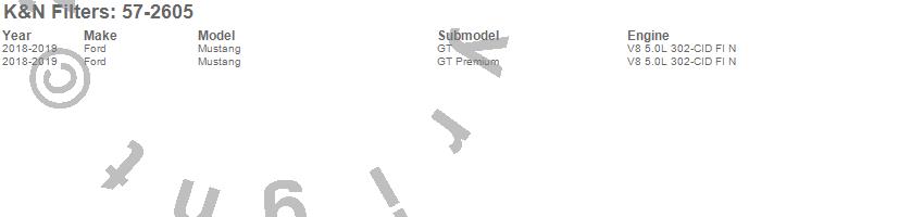 Brand: K&N FiltersPart Number: 57-2605Air Intake Kit Type: Not Flanged - Red Air Filter - Natural Clamp - Stainless Steel Clamp - Incl. Mass Air Flow Sensor Adapter When RequiredUPC: 024844371485