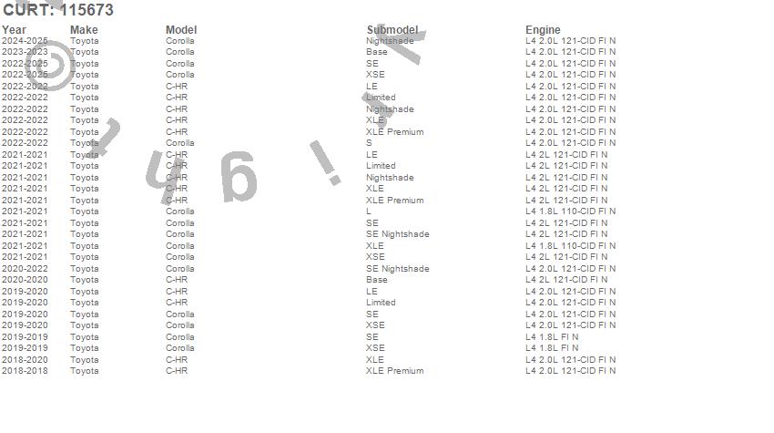 Below is an abbreviated list of applications for the Class I 1.25 in. Receiver Hitch.C-HR, Corolla, Toyota, 2025, 2024, 2023, 2022, 2021, 2020, 2019, 2018