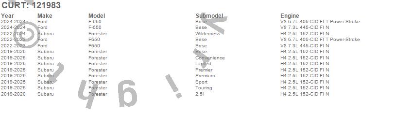 Below is an abbreviated list of applications for the Class II 1.25 in. Receiver Hitch.Forester, Subaru, 2025, 2024, 2023, 2022, 2021, 2020, 2019