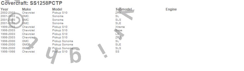 Below is an abbreviated list of applications for the SeatSaver Custom Seat Cover.S10 Pickup, Sonoma, Chevrolet, GMC, 2003, 2002, 2001, 2000, 1999, 1998