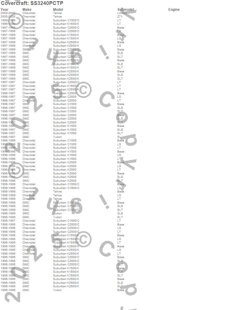 Below is an abbreviated list of applications for the SeatSaver Custom Seat Cover.C1500 Suburban, C2500 Suburban, K1500 Suburban, K2500 Suburban, Tahoe, Yukon, Chevrolet, GMC, 2000, 1999, 1998, 1997, 1996, 1995