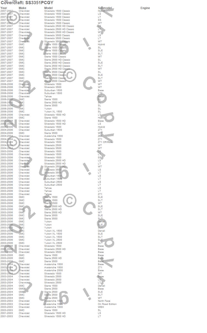 Below is an abbreviated list of applications for the SeatSaver Custom Seat Cover.Avalanche 1500, Avalanche 2500, Sierra 1500, Sierra 1500 Classic, Sierra 2500, Sierra 2500 HD, Sierra 2500 HD Classic, Sierra 3500, Sierra 3500 Classic, Silverado 1500, Silverado 1500 Classic, Silverado 1500 HD, Silverado 2500, Silverado 2500 HD, Silverado 2500 HD Classic, Silverado 3500, Silverado 3500 Classic, Suburban 1500, Suburban 2500, Tahoe