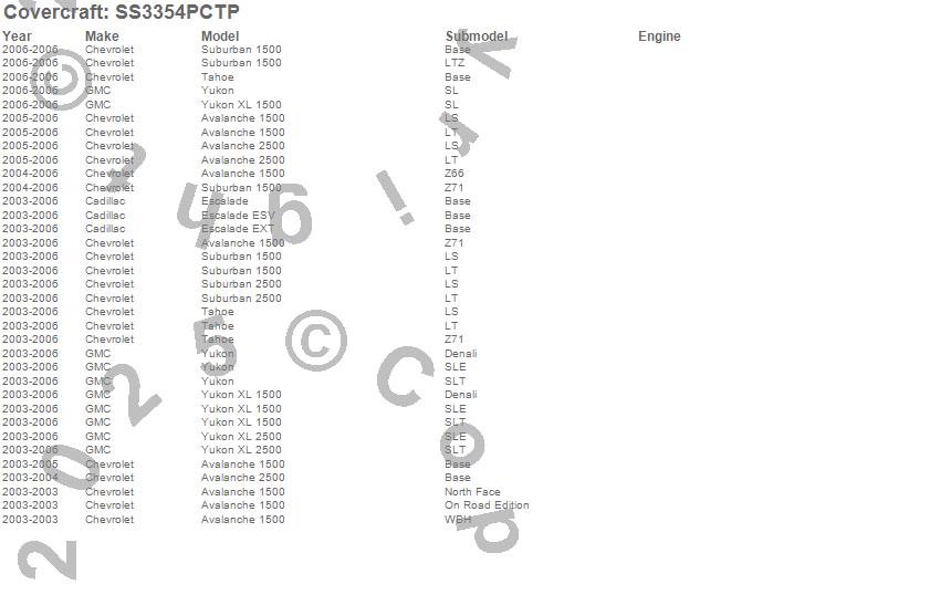 Below is an abbreviated list of applications for the SeatSaver Custom Seat Cover.Avalanche 1500, Avalanche 2500, Escalade, Escalade ESV, Escalade EXT, Suburban 1500, Suburban 2500, Tahoe, Yukon, Yukon XL 1500, Yukon XL 2500, Cadillac, Chevrolet, GMC, 2006, 2005, 2004, 2003