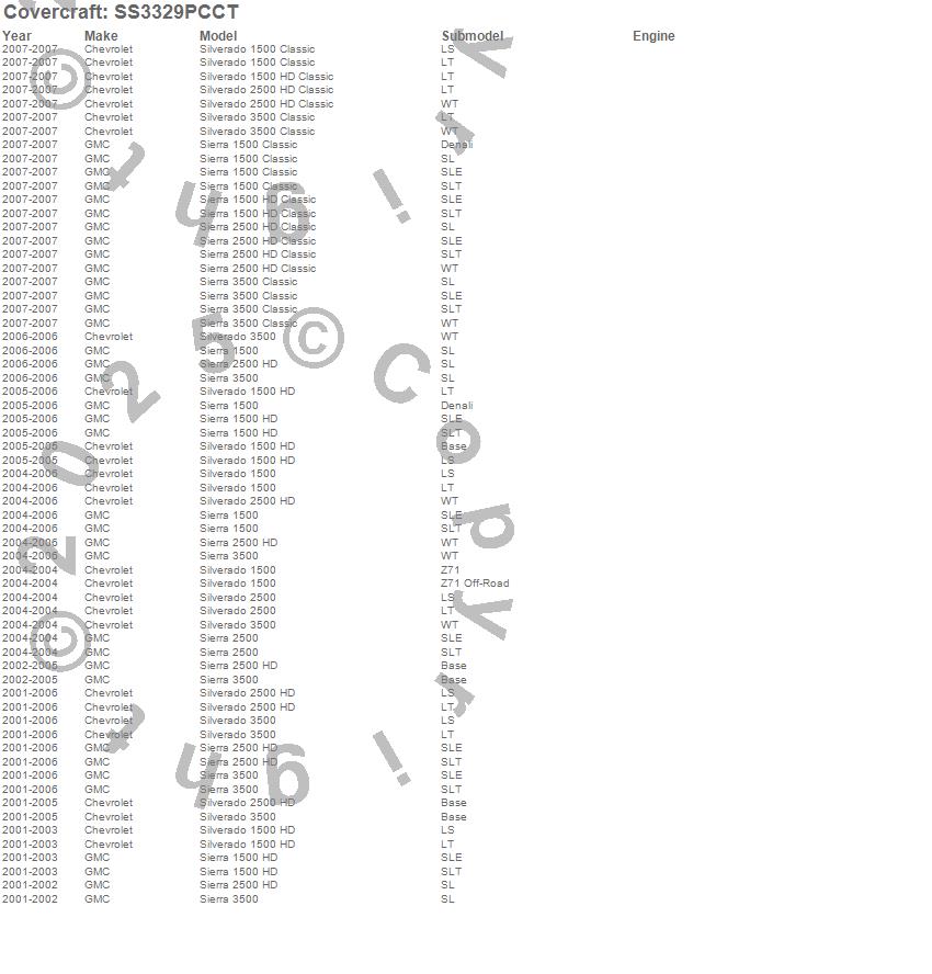 Below is an abbreviated list of applications for the SeatSaver Custom Seat Cover.Sierra 1500, Sierra 1500 Classic, Sierra 1500 HD, Sierra 1500 HD Classic, Sierra 2500, Sierra 2500 HD, Sierra 2500 HD Classic, Sierra 3500, Sierra 3500 Classic, Silverado 1500, Silverado 1500 Classic, Silverado 1500 HD, Silverado 1500 HD Classic, Silverado 2500, Silverado 2500 HD, Silverado 2500 HD Classic, Silverado 3500, Silverado 3500 Classic, Chevrolet, GMC