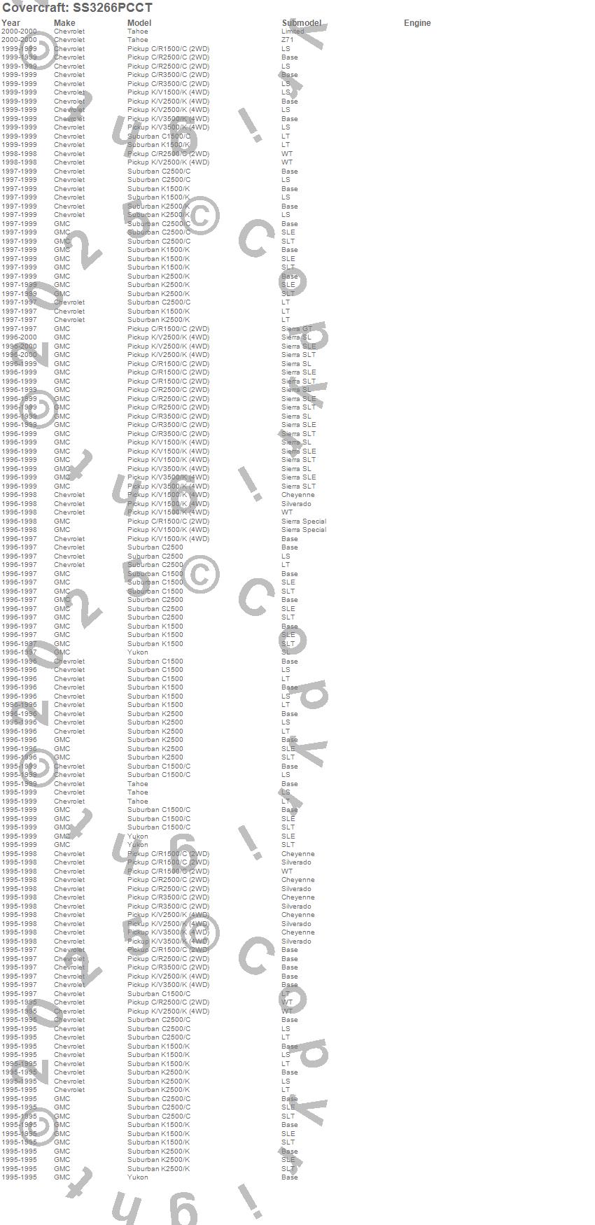 Below is an abbreviated list of applications for the SeatSaver Custom Seat Cover.C1500 Pickup, C1500 Suburban, C2500 Pickup, C2500 Suburban, C3500 Pickup, K1500 Pickup, K1500 Suburban, K2500 Pickup, K2500 Suburban, K3500 Pickup, Tahoe, Yukon, Chevrolet, GMC, 2000, 1999, 1998, 1997, 1996, 1995