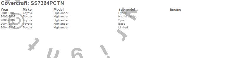 Below is an abbreviated list of applications for the SeatSaver Custom Seat Cover.Highlander, Toyota, 2007, 2006, 2005, 2004
