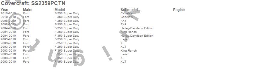 Below is an abbreviated list of applications for the SeatSaver Custom Seat Cover.F-250 Super Duty, F-350 Super Duty, Ford, 2010, 2009, 2008, 2007, 2006, 2005, 2004, 2003