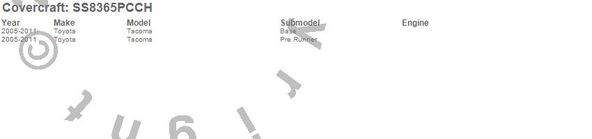 Below is an abbreviated list of applications for the SeatSaver Custom Seat Cover.Tacoma, Toyota, 2011, 2010, 2009, 2008, 2007, 2006, 2005