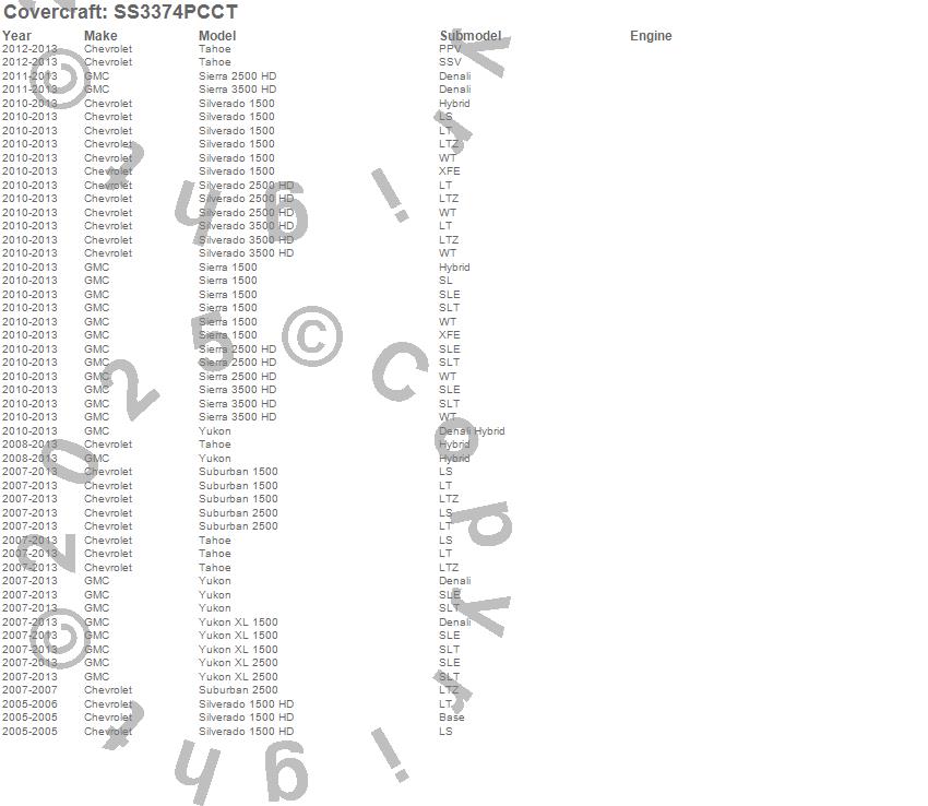 Below is an abbreviated list of applications for the SeatSaver Custom Seat Cover.Sierra 1500, Sierra 2500 HD, Sierra 3500 HD, Silverado 1500, Silverado 1500 HD, Silverado 2500 HD, Silverado 3500 HD, Suburban 1500, Suburban 2500, Tahoe, Yukon, Yukon XL 1500, Yukon XL 2500, Chevrolet, GMC, 2013, 2012, 2011, 2010, 2009
