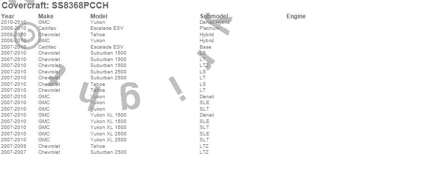 Below is an abbreviated list of applications for the SeatSaver Custom Seat Cover.Escalade ESV, Suburban 1500, Suburban 2500, Tahoe, Yukon, Yukon XL 1500, Yukon XL 2500, Cadillac, Chevrolet, GMC, 2010, 2009, 2008, 2007
