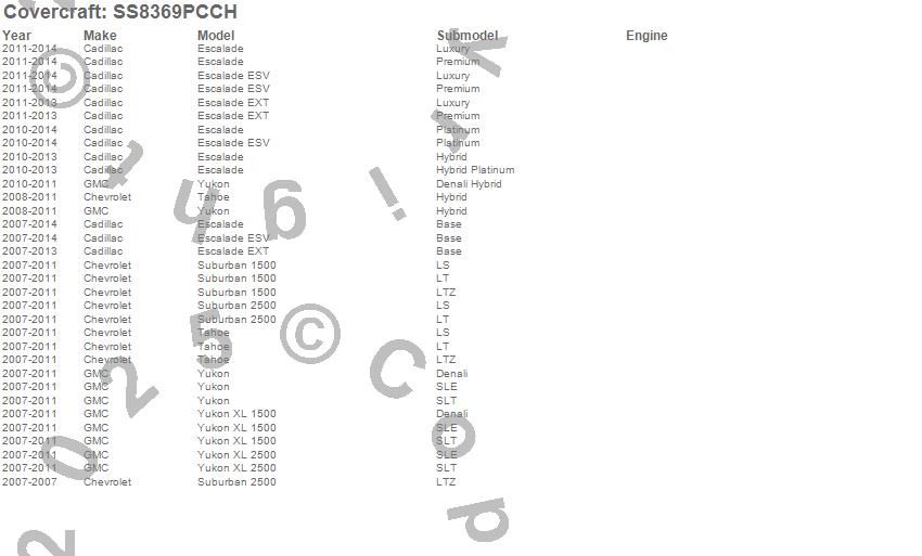 Below is an abbreviated list of applications for the SeatSaver Custom Seat Cover.Escalade, Escalade ESV, Escalade EXT, Suburban 1500, Suburban 2500, Tahoe, Yukon, Yukon XL 1500, Yukon XL 2500, Cadillac, Chevrolet, GMC, 2014, 2013, 2012, 2011, 2010, 2009, 2008, 2007