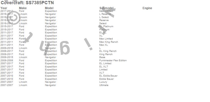 Below is an abbreviated list of applications for the SeatSaver Custom Seat Cover.Expedition, Navigator, Ford, Lincoln, 2017, 2016, 2015, 2014, 2013, 2012, 2011, 2010, 2009, 2008, 2007
