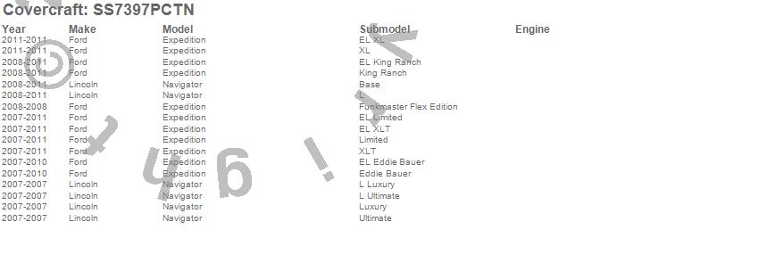 Below is an abbreviated list of applications for the SeatSaver Custom Seat Cover.Expedition, Navigator, Ford, Lincoln, 2011, 2010, 2009, 2008, 2007