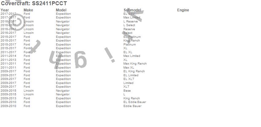 Below is an abbreviated list of applications for the SeatSaver Custom Seat Cover.Expedition, Navigator, Ford, Lincoln, 2017, 2016, 2015, 2014, 2013, 2012, 2011, 2010, 2009