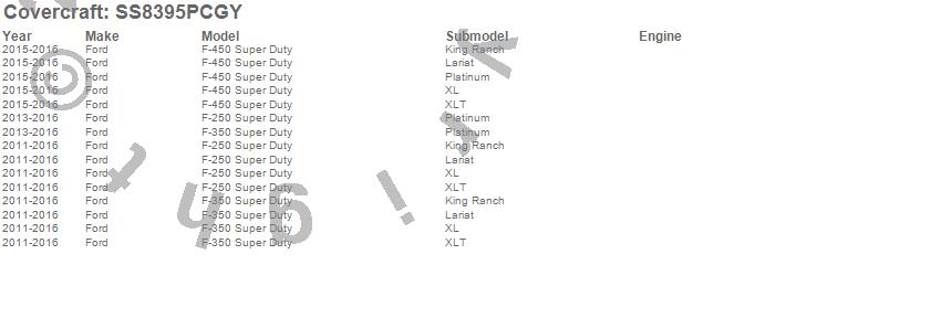 Below is an abbreviated list of applications for the SeatSaver Custom Seat Cover.F-250 Super Duty, F-350 Super Duty, F-450 Super Duty, Ford, 2016, 2015, 2014, 2013, 2012, 2011
