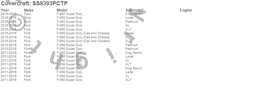 Below is an abbreviated list of applications for the SeatSaver Custom Seat Cover.F-250 Super Duty, F-350 Super Duty, F-450 Super Duty, F-550 Super Duty, Ford, 2016, 2015, 2014, 2013, 2012, 2011