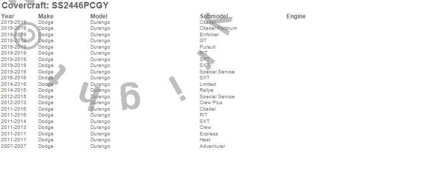 Below is an abbreviated list of applications for the SeatSaver Custom Seat Cover.Durango, Dodge, 2019, 2016, 2015, 2014, 2013, 2012, 2011, 2007