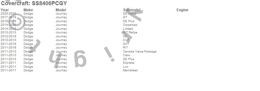 Below is an abbreviated list of applications for the SeatSaver Custom Seat Cover.Journey, Dodge, 2020, 2019, 2018, 2017, 2016, 2015, 2014, 2013, 2012, 2011