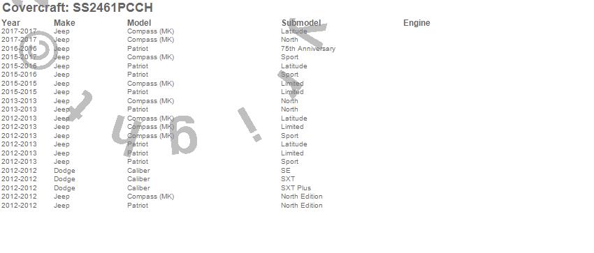 Below is an abbreviated list of applications for the SeatSaver Custom Seat Cover.Caliber, Compass, Patriot, Dodge, Jeep, 2017, 2016, 2015, 2013, 2012