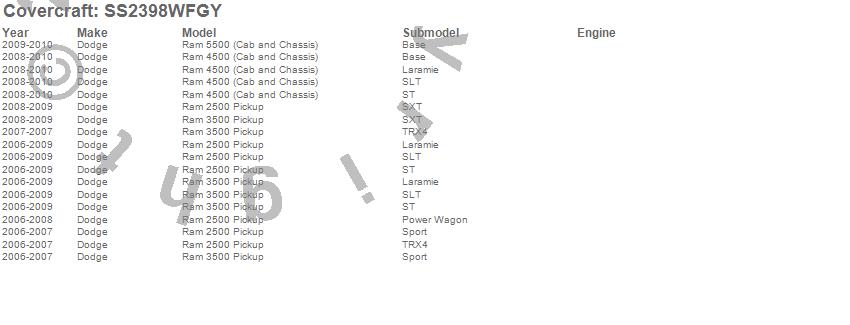 Below is an abbreviated list of applications for the SeatSaver Custom Seat Cover.Ram 2500, Ram 3500, Ram 4500, Ram 5500, Dodge, 2010, 2009, 2008, 2007, 2006