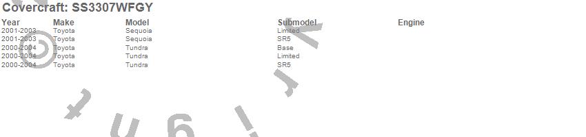 Below is an abbreviated list of applications for the SeatSaver Custom Seat Cover.Sequoia, Tundra, Toyota, 2004, 2003, 2002, 2001, 2000