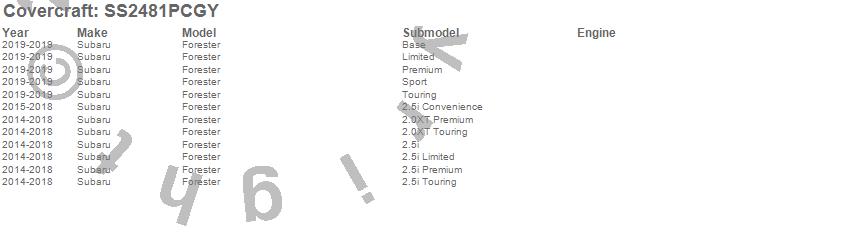 Below is an abbreviated list of applications for the SeatSaver Custom Seat Cover.Forester, Subaru, 2019, 2018, 2017, 2016, 2015, 2014
