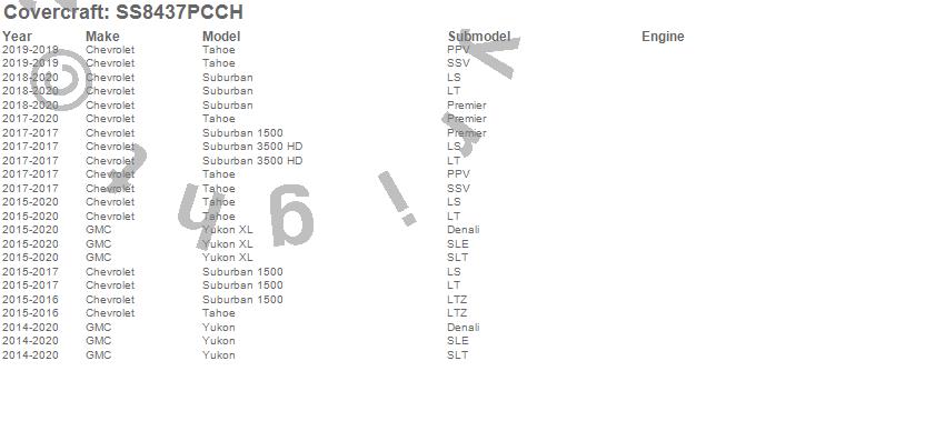 Below is an abbreviated list of applications for the SeatSaver Custom Seat Cover.Suburban, Suburban 1500, Suburban 3500 HD, Tahoe, Yukon, Yukon XL, Chevrolet, GMC, 2020, 2019, 2018, 2017, 2016, 2015, 2014