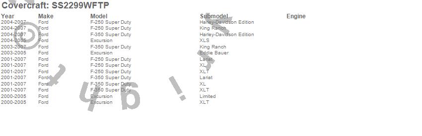 Below is an abbreviated list of applications for the SeatSaver Custom Seat Cover.Excursion, F-250 Super Duty, F-350 Super Duty, Ford, 2007, 2006, 2005, 2004, 2003, 2002, 2001, 2000