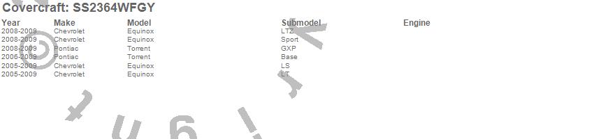Below is an abbreviated list of applications for the SeatSaver Custom Seat Cover.Equinox, Torrent, Chevrolet, Pontiac, 2009, 2008, 2007, 2006, 2005