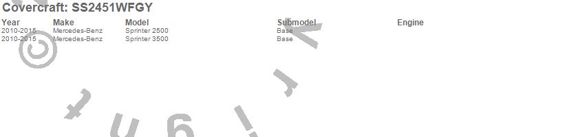 Below is an abbreviated list of applications for the SeatSaver Custom Seat Cover.Sprinter 2500, Sprinter 3500, Mercedes-Benz, 2015, 2014, 2013, 2012, 2011, 2010