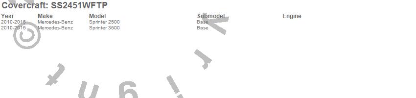 Below is an abbreviated list of applications for the SeatSaver Custom Seat Cover.Sprinter 2500, Sprinter 3500, Mercedes-Benz, 2015, 2014, 2013, 2012, 2011, 2010