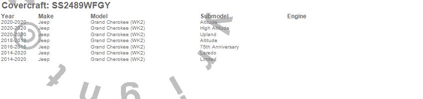 Below is an abbreviated list of applications for the SeatSaver Custom Seat Cover.Grand Cherokee (WK2), Jeep, 2020, 2019, 2018, 2017, 2016, 2015, 2014