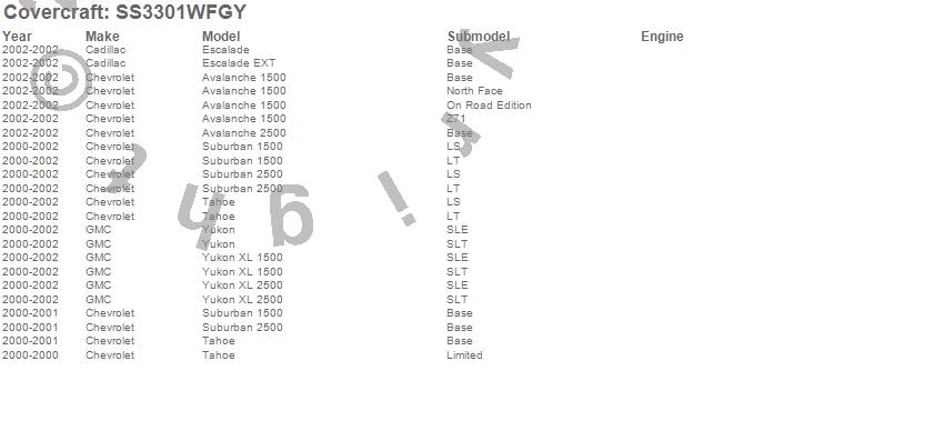 Below is an abbreviated list of applications for the SeatSaver Custom Seat Cover.Avalanche 1500, Avalanche 2500, Escalade, Escalade EXT, Suburban 1500, Suburban 2500, Tahoe, Yukon, Yukon XL 1500, Yukon XL 2500, Cadillac, Chevrolet, GMC, 2002, 2001, 2000