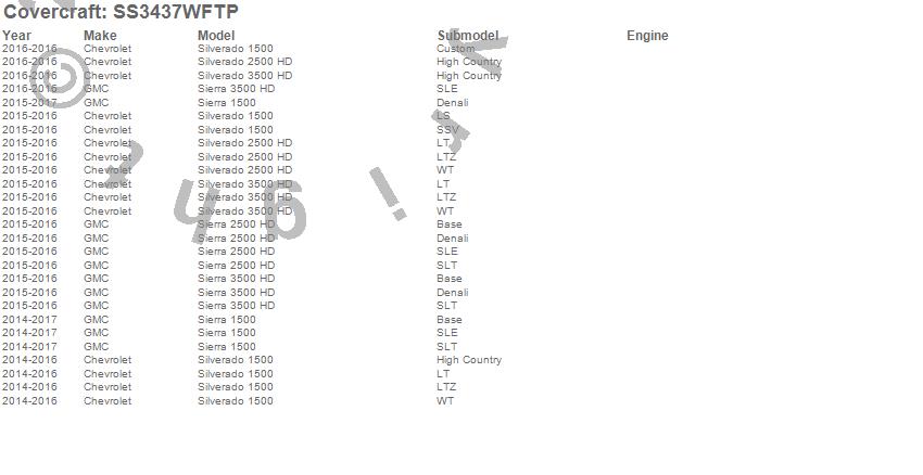 Below is an abbreviated list of applications for the SeatSaver Custom Seat Cover.Sierra 1500, Sierra 2500 HD, Sierra 3500 HD, Silverado 1500, Silverado 2500 HD, Silverado 3500 HD, Chevrolet, GMC, 2017, 2016, 2015, 2014