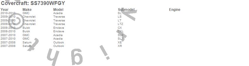 Below is an abbreviated list of applications for the SeatSaver Custom Seat Cover.Acadia, Enclave, Outlook, Traverse, Buick, Chevrolet, GMC, Saturn, 2010, 2009, 2008, 2007