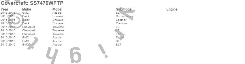 Below is an abbreviated list of applications for the SeatSaver Custom Seat Cover.Acadia, Enclave, Traverse, Buick, Chevrolet, GMC, 2016, 2015